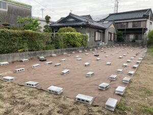 また、風も強いお土地柄だったこともあり、防草シートの固定にはピンのみではなく、